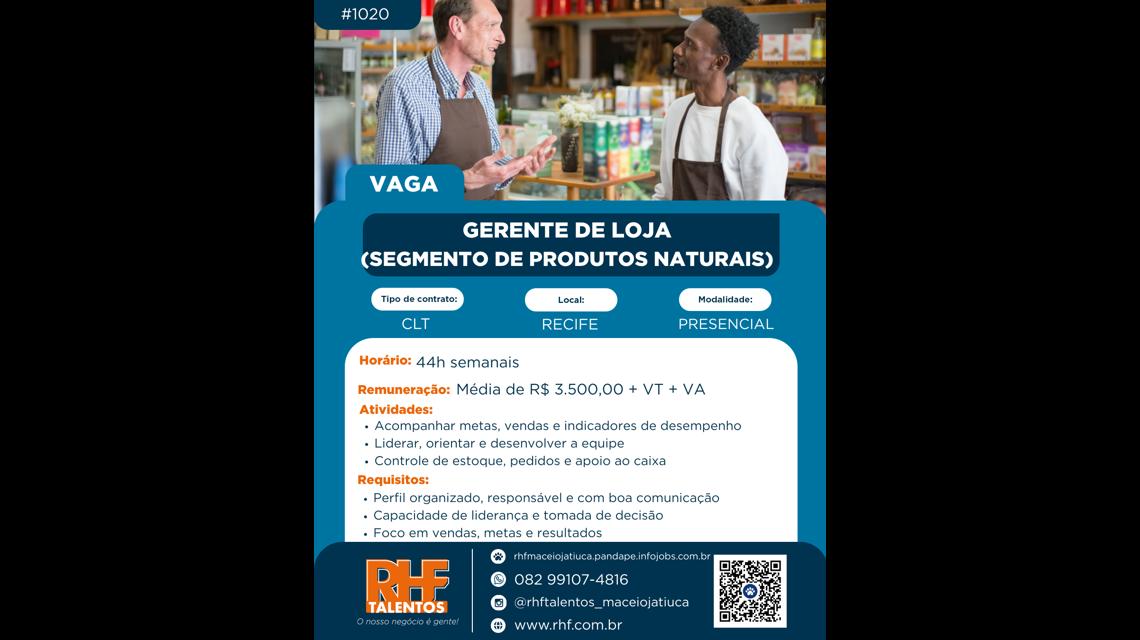 Rede de lojas de produtos naturais contrata Gerente de Loja para atuação na gestão de duas unidades próximas entre si, com foco em resultados, organização e liderança de equipe.
